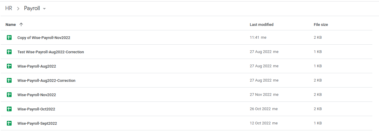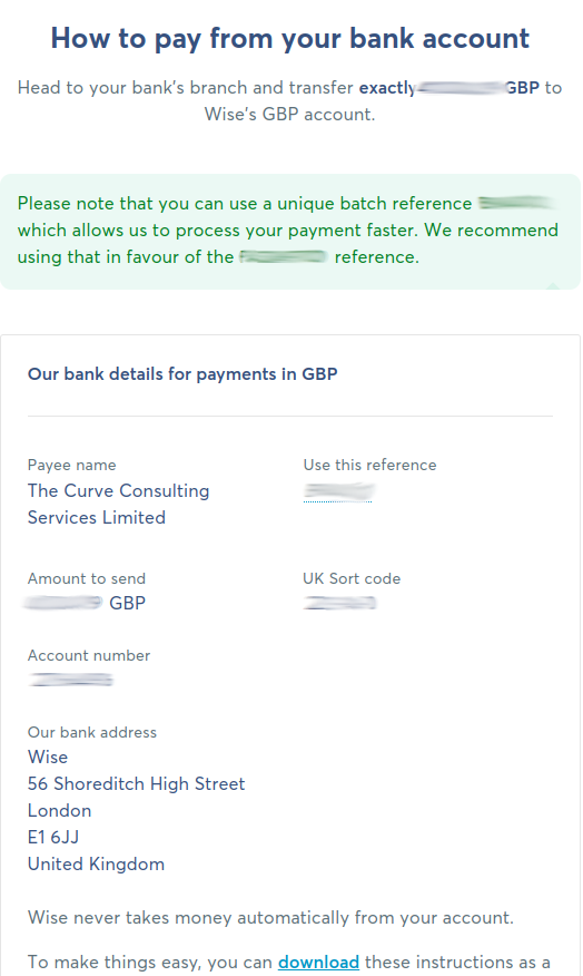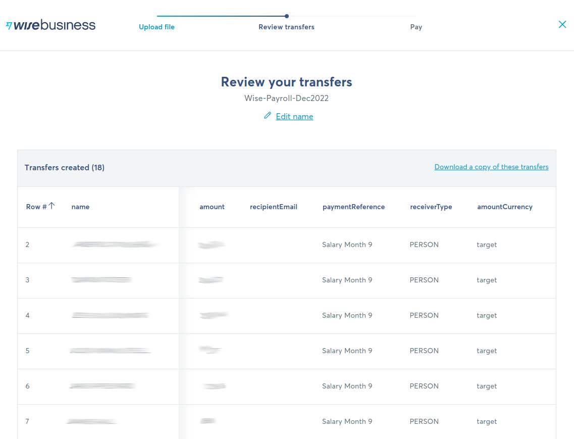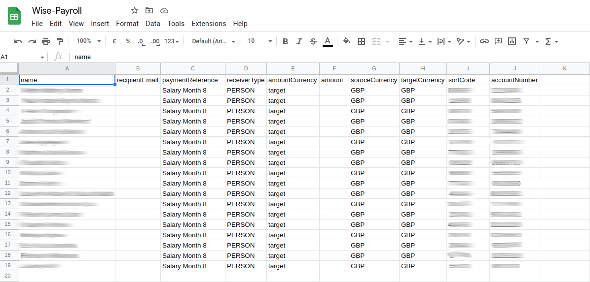 I have created a template to use with Wise based on their sample which includes the employees and their bank details.