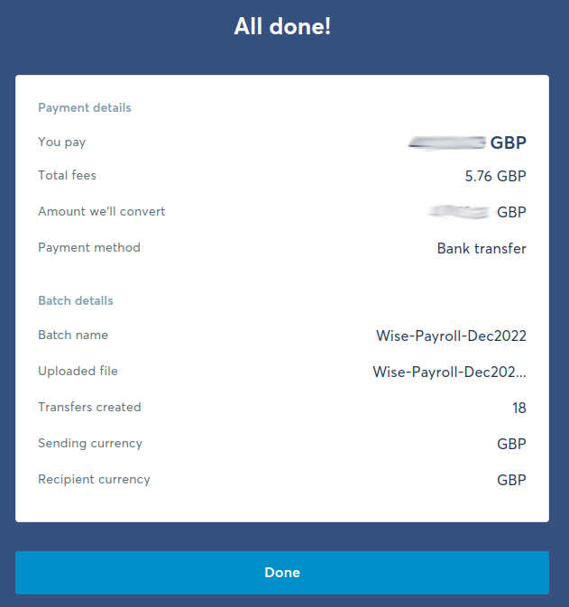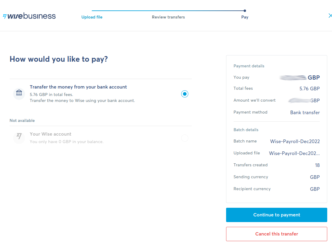 Once I'm confident the transfers are correct we have to add funds to Wise. For a batch we can do a one-off transfer with a unique reference. Below we can also clearly see the fees (£5.76 for 18 transactions).