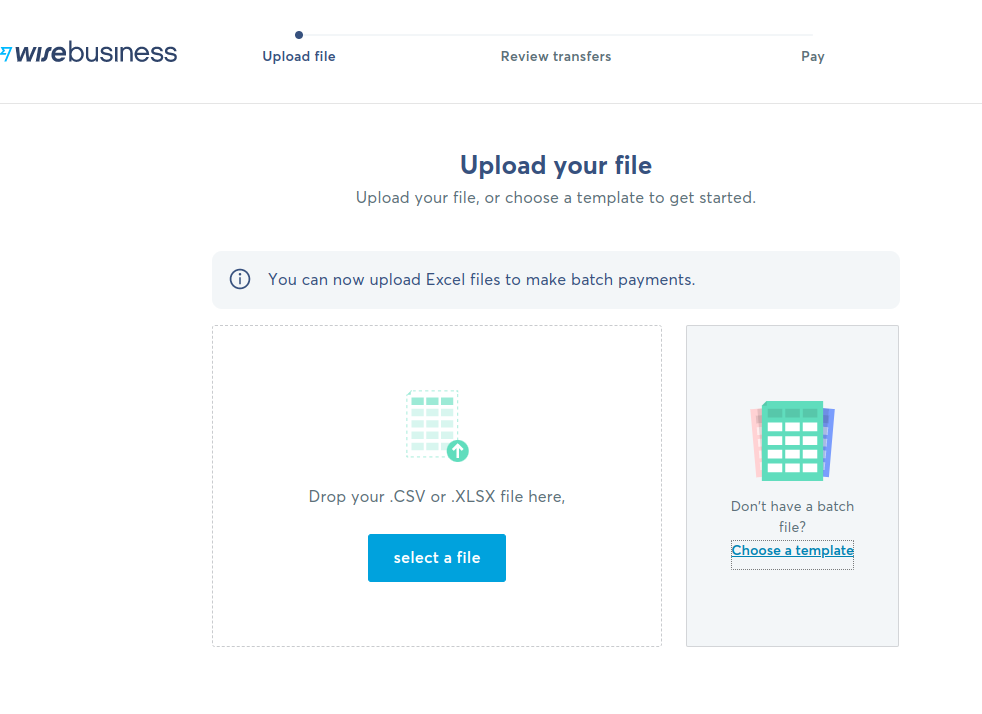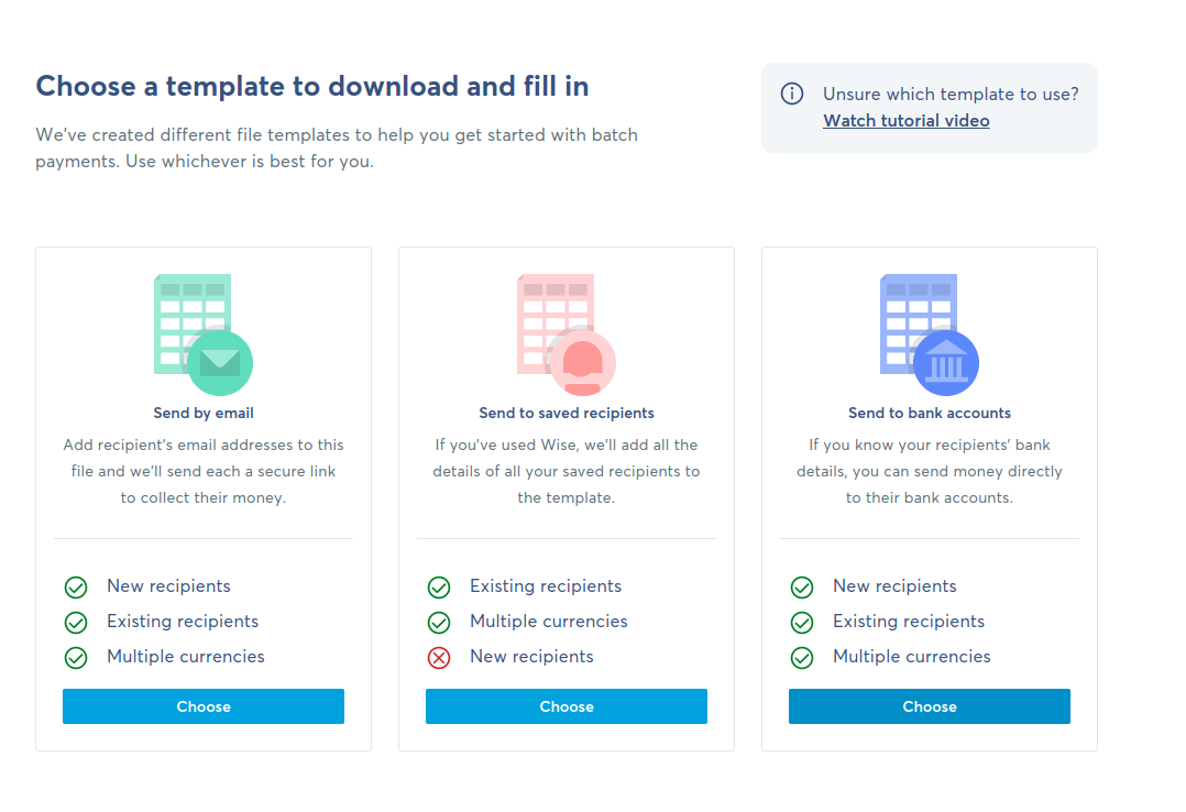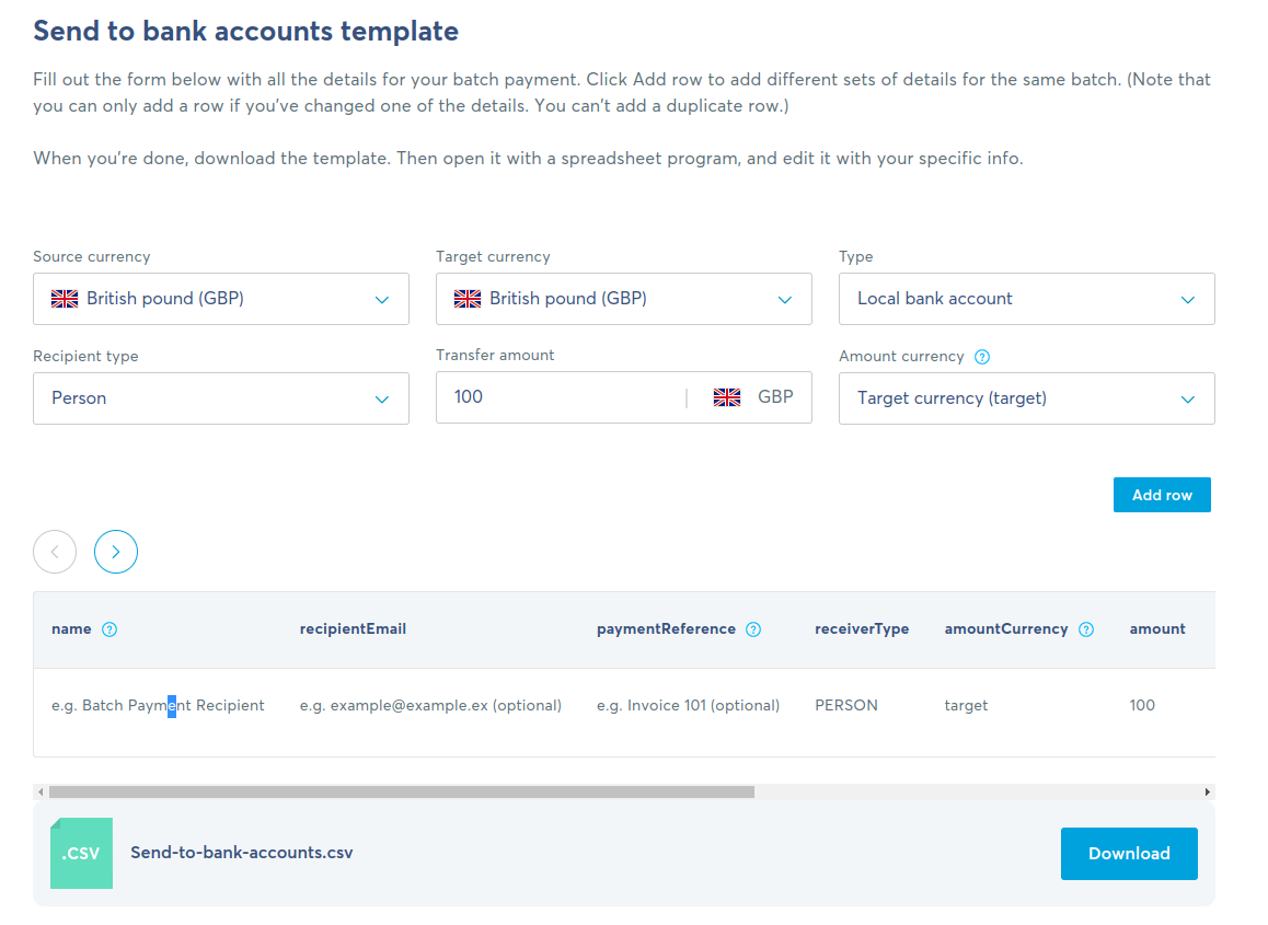 There are also templates available to download which is how I created my initial payroll sheet, I opted to "Send to bank accounts" so if the recipient list changes I don't have to manually add or remove staff from Wise: