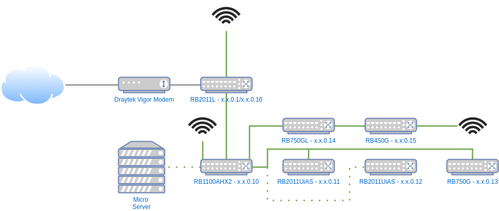 The internet comes in via the Phone-line (ADSL2) to the Draytek modem in bridge mode and is connected to via the RB2011L at the top which establishes the PPPoE connection, as well as providing NAT services to the local network.