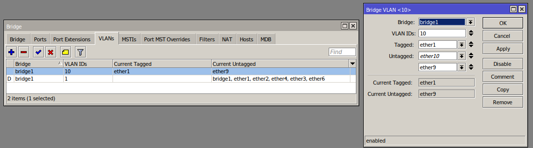 Ports 9 and 10 are untagged to 10, the rest are untagged to 1 (10 is disconnected right now).