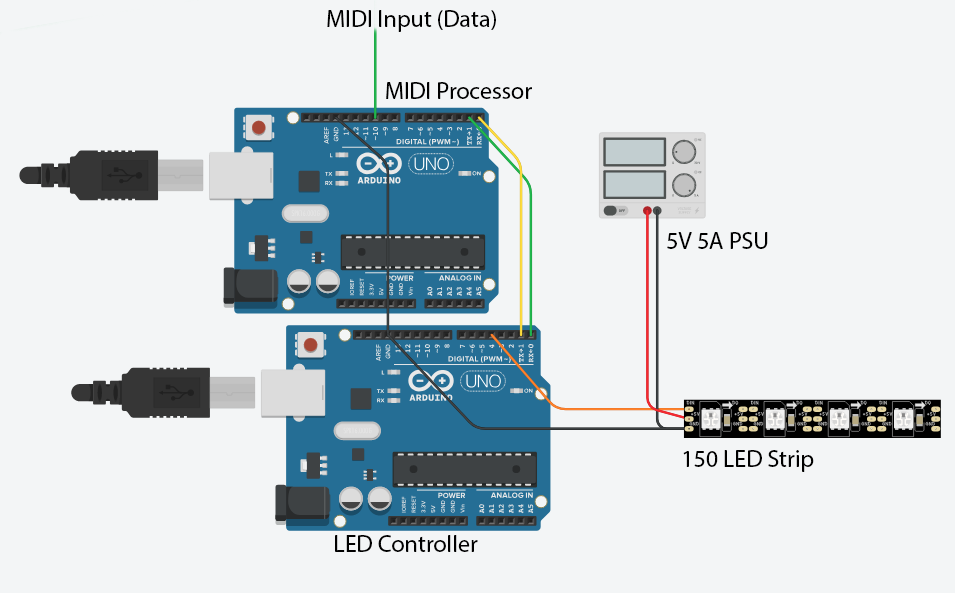 To get around this issue I used two Arduinos talking to each other over a Serial port. One Arduino listens to the MIDI messages, maps those triggers onto animations and sends the resulting 'render' to the second Arduino which updates the LED strip based on the serial data.