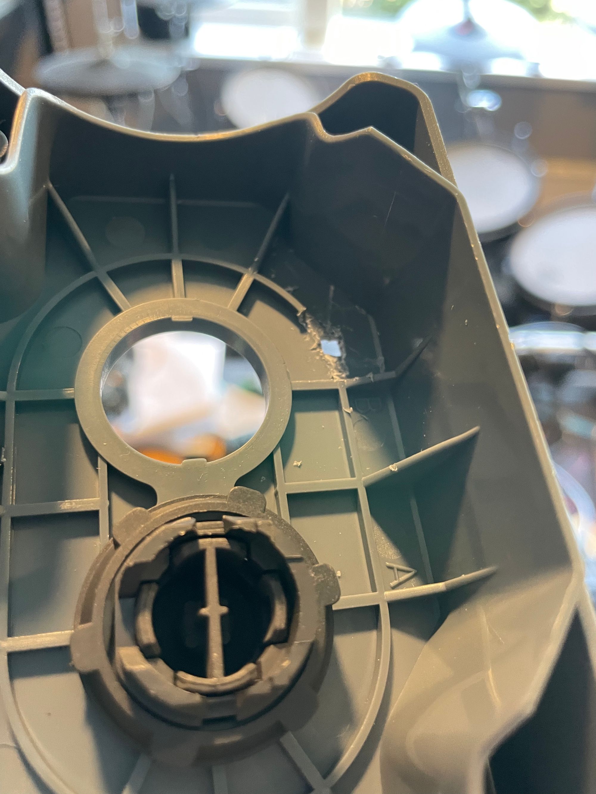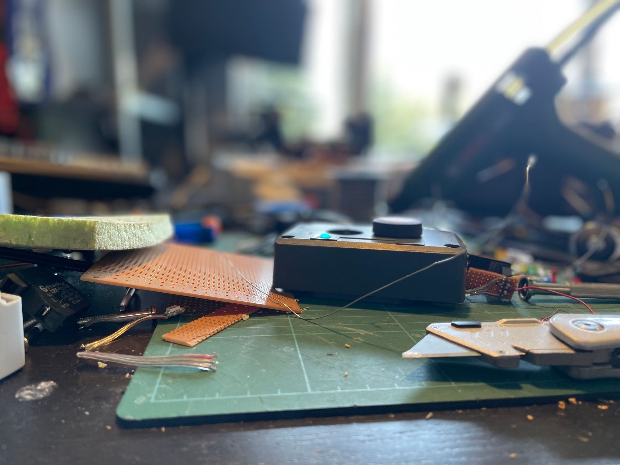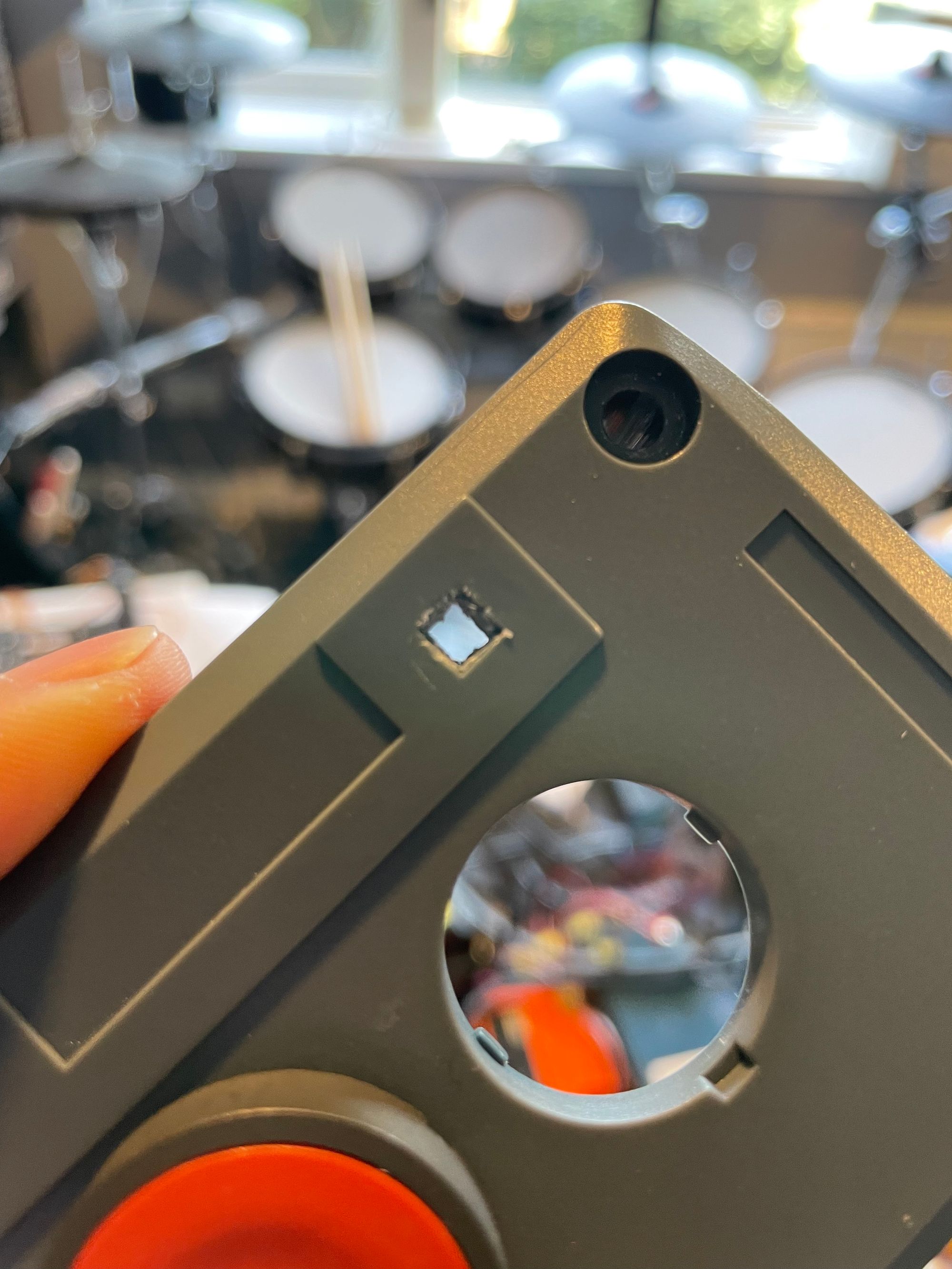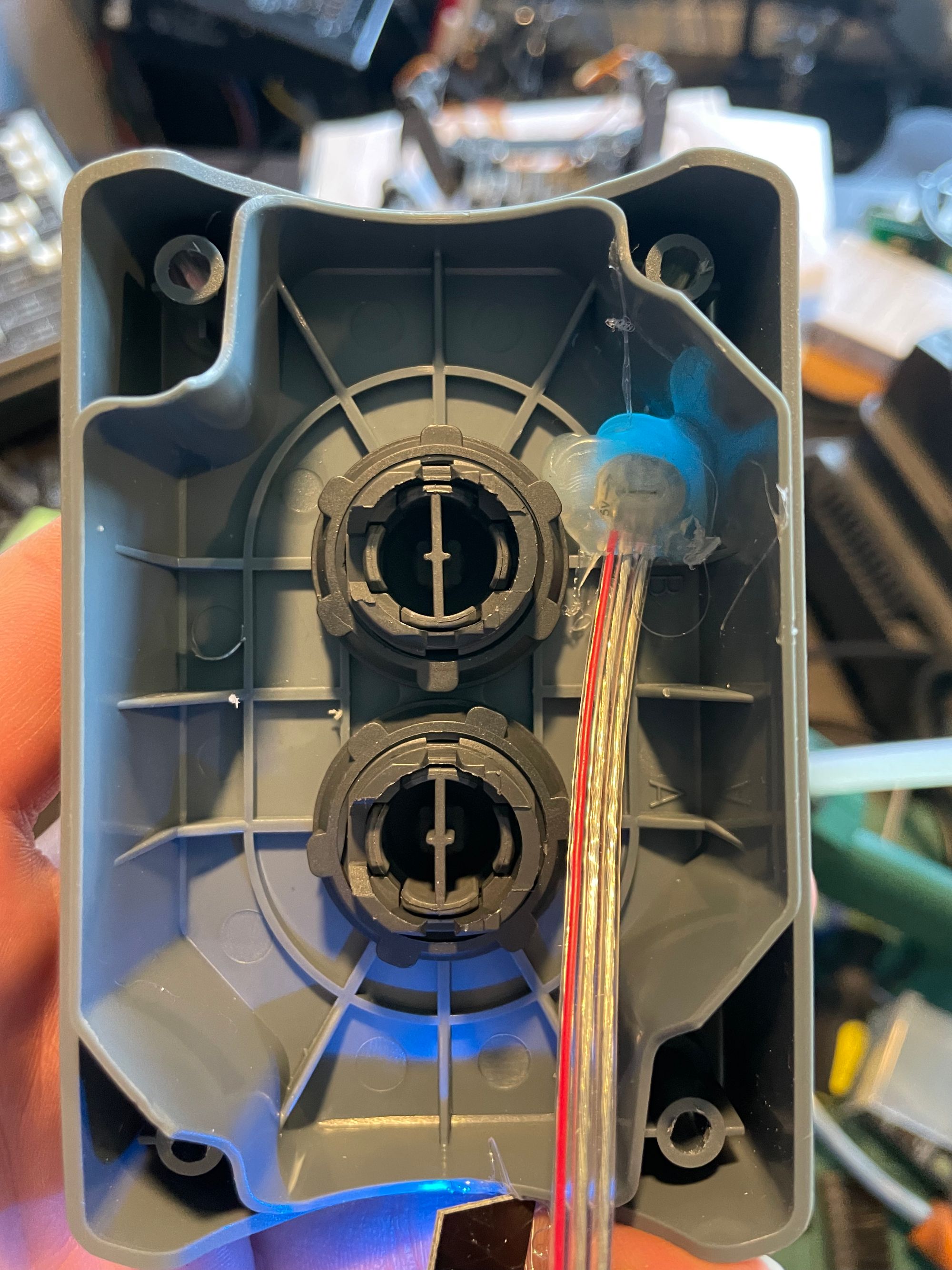 The indicator area was cut out by hand and filled with hot glue to create a form of cloudy fibre-optic indicator (see the gallery below).