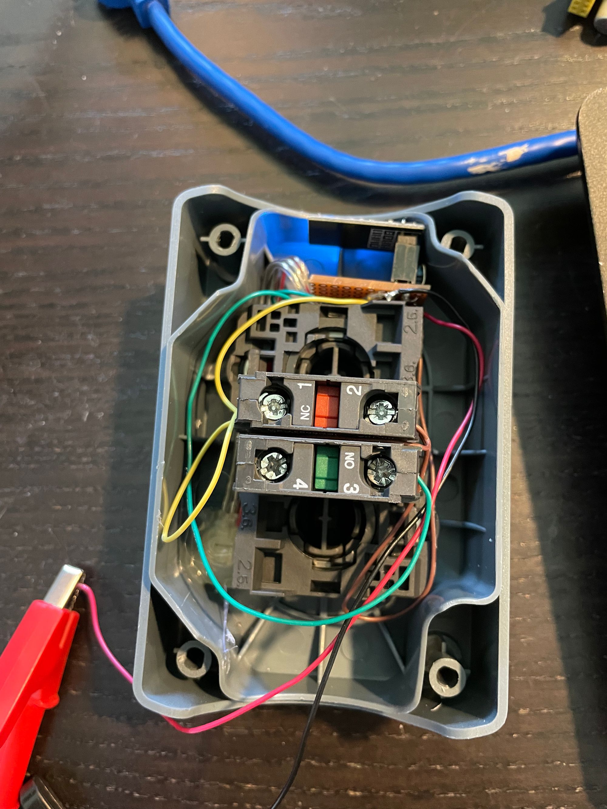 One note of caution is that often the red switches are Normally Closed (NC), whereas the green switches are normally open, which is "more normal". This means that the NC switches are connected by default, and break when pressed.